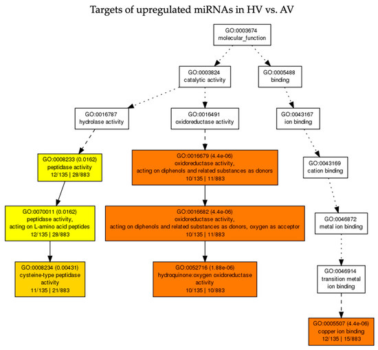 Acyclic graph showing hierarchical relationship of the enriched gene ontology (GO) terms associated with targets predicted from upregulated miRNAs in CaCV-infected capsicum grown at high temperature (HV) compared to ambient temperature (AV) in the molecular function category. The color scale from yellow to red indicates an increasingly significant enrichment of GO terms.