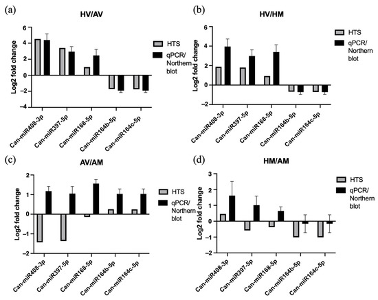 To confirm the sRNA sequencing data, S- poly(A)-tailed real-time RT-PCR or Northern blot with signal intensity quantification was used to quantify the levels of selected miRNAs at 10 dpi. Based on the results of the differential expression analysis of miRNAs and functional analysis of targets, Can-miR408a-3p, Can-miR397-5p, and Can-miR164b/c-5p were selected based on their potential involvement in temperature-dependent resistance-breaking. In addition, Can-miR168-5p, which was upregulated with a log2-fold change of 1.0 and Padj of 0.017 in HV compared to the AV condition, was selected despite the cut-off threshold of Padj ≤ 0.01. This exception was based on the reported importance of miR168. Accumulation of miR168 compromises AGO1-mediated antiviral RNA silencing in several virus-infected plant species [70,71,72]. In addition, accumulation of miR168 may affect the expression of many target genes since AGO1 plays a central role in RNA silencing [73]. The results of the real-time RT-PCR and Northern blot (Figure S5) confirmed the increased expression levels of Can-miR408a-3p, Can-miR397-5p, and Can-miR168-5p as well as the decreased expression level of Can-miR164b/c-5p in HV compared to AV treatments, and showed that they were consistent with the expression profiles obtained by sRNA sequencing (Figure 7a). When HV was compared to HM, the expression trends of Can-miR408a-3p, Can-miR397-5p, and Can-miR164b/c-5p were similar between the results observed in real-time RT-PCR and sRNA sequencing (Figure 7b). However, expression trends of Can-miR408a-3p, Can-miR397-5p, and Can-miR168-5p in the AV and AM comparison were opposite between the results of real-time RT-PCR and sRNA sequencing (Figure 7c).