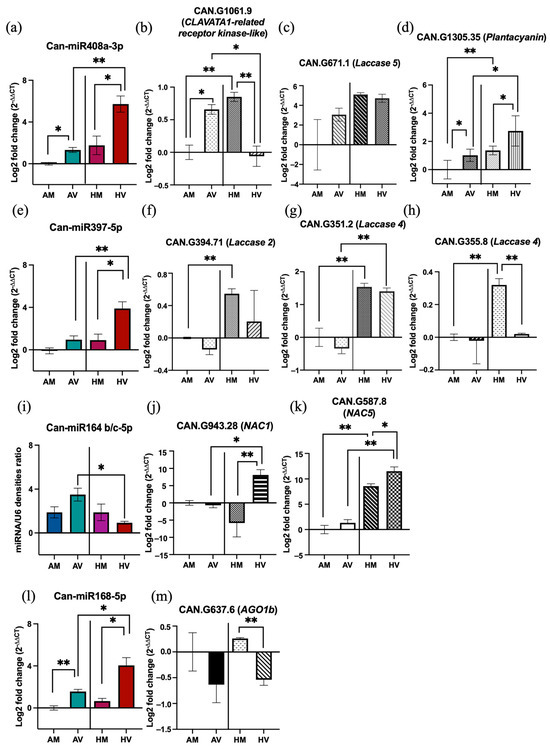 In addition to analyzing the expression of mature miRNAs, quantitative real-time RT-PCR was also used to investigate the effect of these miRNAs on their target genes in the HV condition. Targets were selected based on the target prediction data obtained from psRNAtarget and WPMIAS software [74] as well as the target validation data reported by Zhang and collaborators [75]. CAN.G1061.9 (CLAVATA1-related), CAN.G671.1 (Laccase 5, LAC5), and CAN.G1305.35 (Plantacyanin) were chosen for Can-miR408a-3p target analysis; CAN.G394.71 (LAC2), CAN.G351.2 (LAC4), and CAN.G355.8 (LAC4) were chosen for Can-miR397-5p target analysis; CAN.G637.6 (AGO1b) was chosen for Can-miR168-5p target analysis; NAM/ATAF1,2/CUC2 (NAC) transcription factors—CAN.G943.28 (NAC1) and CAN.G587.8 (NAC5)—were chosen for Can-miR164b/c-5p target analysis. Unexpectedly, expression patterns of the targets CAN.G671.1, CAN.G1305.35, CAN.G394.71, CAN.G351.2, CAN.G355.8, and CAN.G637.6 were not inverse to the expression of their corresponding miRNAs when comparing the HV and AV conditions (Figure 8c,d,f–h,m). Conversely, the expected inverse expression pattern was observed in Can-miR408a-3p/CAN.G1061.9, Can-miR164b/c-5p/CAN.G943.28, and Can-miR164b/c-5p/CAN.G587.8 pairs (Figure 8b,j,k). Notably, we found that the transcript levels of all three selected targets of Can-miR397-5p in mock-inoculated plants drastically increased at HT (Figure 8f–h). Moreover, the transcript level of one of the targets, CAN.G355.8, was downregulated, while that of the other two targets (Figure 8h), CAN.G394.71 and CAN.G351.2, remained unchanged in CaCV-infected plants as compared with mock-inoculated plants at HT (Figure 8f,g). These results suggest that the downregulation of CAN.G355.8 may be due to the negative regulation of upregulated Can-miR397-5p in HV compared to HM. Similarly, an inverse expression pattern between Can-miR168-5p and CAN.G637.6 was also observed in HV vs. HM (Figure 8m). Different from other targets that showed inverse or no correlation tendency with miRNAs, CAN.G1305.35 showed a positively correlated expression pattern with Can-miR408a-3p in three pairwise comparisons (AV vs. AM, HV vs. HM, and HV vs. AV) (Figure 8d). Overall, diverse regulatory effects of miRNAs on their targets were observed when plants were treated at different temperatures and biotic stress conditions.