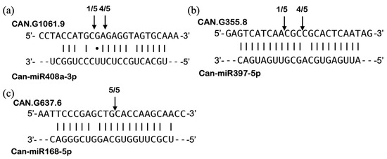 To confirm putative miRNA targets, the specific cleavage sites were identified experimentally using 5′-RACE. Three targets, including CAN.G1061.9, CAN.G355.8, and CAN.G637.6, were chosen for the 5′-RACE verification based on the observed inverse expression patterns of miRNA/target pairs. CAN.G1061.9 was selected for its inverse expression pattern at HV vs. AV, while CAN.G355.8 and CAN.G637.6 were chosen for their inverse patterns at HV vs. HM. The other targets, CAN.G943.28 and CAN.G587.8, which showed opposite correlation with Can-miR164b/c-5p, were verified by degradome-based miRNAs-target analysis using WPMIAS (Table S10). Based on the results of 5′-RACE, the cleavage sites were all located in the regions that were predicted as miRNA-binding sites (Figure 9). The majority cleavage site in CAN.G1061.9 was mapped to the 11th position of the complementary sequence at the 5′-end of Can-miR408a-3p (Figure 9a). On the other hand, the main cleavage site in CAN.G355.8 and CAN.G637.6 was mapped to the 10th position of the complementary sequences at the 5′-end of Can-miR397-5p and Can-miR168-5p, respectively (Figure 9b,c). These results suggest that CAN.G1061.9, CAN.G355.8, and CAN.G637.6 can be cleaved by Can-miR408a-3p, Can-miR397-5p, and Can-miR168-5p, respectively, in capsicum.