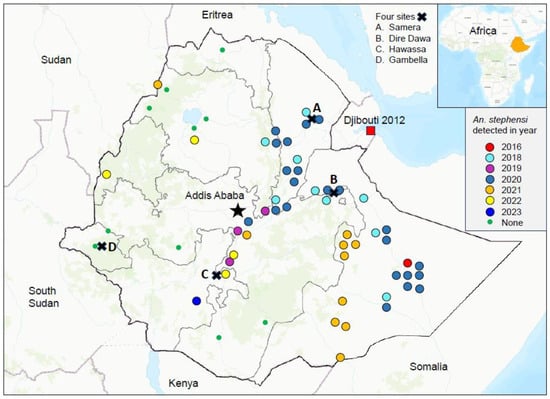 Distribution map of An. stephensi from 2016 to 2023 and the locations of the four study sites (shown in Figure 4) in Ethiopia.