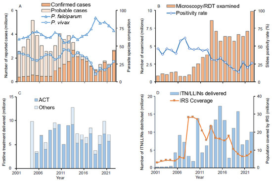 (A) Reported clinical malaria cases and parasite species composition from 2001 to 2022; (B) Number of RDT and microscopically examined blood samples and slide positivity rate from 2001 to 2022; (C) Antimalarial drugs delivered from 2005 to 2022; and (D) ITN/LLIN distribution and IRS population coverage from 2001 to 2022. ACT: Artemisinin–based combination therapy; ITN: Insecticide-treated nets; LLIN: Long-lasting insecticidal nets; IRS: Indoor residual spraying; RDT: Rapid diagnostic test.