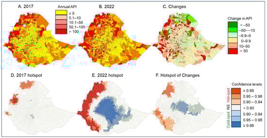 Top panel: Map of malaria annual parasite incidence (API) distribution in 2017 (A), 2022 (B), and changes from 2017 to 2022 (C). Bottom panel: The corresponding hot/cold spots detected from the API distribution; hotspotd for 2017 (D), 2022 (E) and changes in incidence (F).