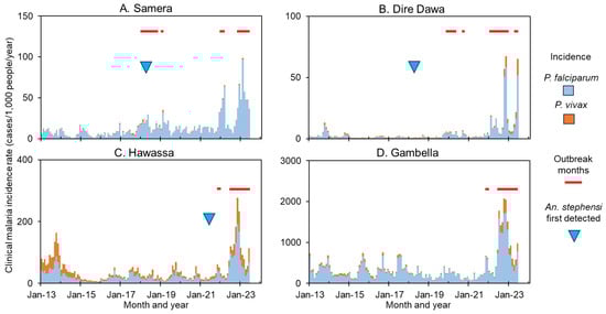 Ten-year dynamics of clinical malaria showed a strong heterogeneity (Figure 4, Supplement Figures S2–S5). Figure 4 showed the examples of outbreaks detected from 2018 to 2023 in randomly selected four sites across Ethiopia, i.e., Semera, Dire Dawa, Hawassa and Gambella (Figure 1). In addition to outbreaks detected at all four sites in 2022/23, outbreaks were also detected in 2018 in Semera and Dire Dawa (Figure 4). So far An. stephensi has not been detected in Gambella despite 7 years of continuous field surveys (Figure 4 and Figure S1). Trend of clinical malaria dynamics can be classified into four categories (Supplement Figures S2–S5), i.e., sudden recent outbreaks such as in Dire Dawa (Figure S2), declined trend with recent resurgence such as in Adama (Figure S3), stable trend with seasonality such as in Alamata (Figure S4), and overall declining trends such as in Abeshega and Yebelo (Figure S5). Malaria incidence rate increased significantly from 2017 to 2023 in many study sites, while it decreased significantly in other sites (Supplement Figures S2–S4). For example, clinical malaria incidence rates in Dire Dawa increased 9.0-fold in 2023 compared to the average of 2017–2021 (ANOVA with repeated measure, p < 0.01), while in Kemise Town it decreased about 40% during the same period (p < 0.01, Table 2). Overall, malaria outbreaks were detected in 25 of the 33 selected sites (Figure 4, Table 2, Supplement Figures S1–S5, Table S2), indicating the severity of malaria outbreaks in Ethiopia in 2022/23.