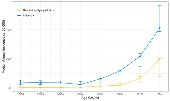 The median annual incidence of RSV- and FLU-positive hospitalizations by age groups between 2016–2022. Error bars represent the interquartile range.