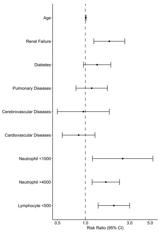 Estimating the risk of poor outcomes at the presentation of an RSV patient to the hospital will have significant implications, including decisions on admission and the level of monitoring and care. We used a multivariable model with the demographic data and the patient’s primary clinical and laboratory data on the first day of admission. Surprisingly, age and comorbidities other than renal failure were not predictive risks of poor outcomes in our study, while abnormal hematological indices, including neutrophilia, neutropenia, and lymphopenia, were significantly associated with an increased risk, with RRs of 2.53, 1.66, and 2.03, respectively. Celante et al. reported a correlation between extreme age (≥85) and neutropenia with mortality [21]. Tseng et al. demonstrated a correlation between extreme age, lymphoma, tachypnea ≥ 26/min, decreased consciousness, acute renal failure, and 60-day mortality [22]. We suggest that although many comorbidities increase the risk of RSV hospitalization, the admissions outcomes are more related to the severity of the clinical presentation, including laboratory markers. Lymphopenia is a well-known marker of severity in some viral infections, including FLU and COVID-19 [23]. Neutropenia is probably a marker of recent chemotherapeutic treatment, which could impair immune responses, and neutrophilia might signal a secondary bacterial infection or an exaggerated inflammatory host response.