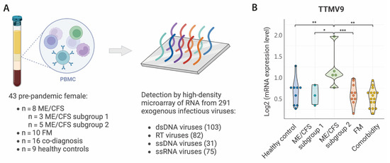 Analysis by high-density microarray of RNA viral sequences in PBMC from patients and controls. (A) Schematic description of the study design. RNA was extracted from isolated PBMCs of participants and further processed for its analysis by HERV-V3 high density microarrays detecting RNA viral sequences from up to 289 viruses. (B) Violin plots summarize the distribution and expression levels of TTMV9 in each study group. Statistical tests: unpaired two-sample Wilcoxon Test with Benjamini–Hochberg p-value correction (* p < 0.05, ** p < 0.01, *** p < 0.001).