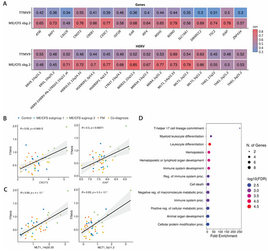 To understand if the increased viral RNA of TTMV9 is associated with the molecular fingerprint previously identified in the same subgroup of ME/CFS patients [9], we searched for potential correlations between the levels of TTMV9 and the associated HERV and gene signatures in all study groups [9] (Figure 2). Moderate correlations with TTMV9 levels were observed for the top DE genes, especially for CNOT3 (R = 0.55, p = 0.00012) and XIAP (X-linked inhibitor of apoptosis protein) (R = 0.5, p = 0.00071) (Figure 2A,B). Interestingly, the genes showing the highest correlation with TTMV9 levels were also strongly correlated with ME/CFS diagnosis for subgroup 2 (as previously published in our preprint [9]) (R = 0.76, p < 0.0001 and R = 0.78, p < 0.0001, respectively; Figure 2A), indicating the potential involvement of TTMV9 levels with disease and gene expression in this patient subgroup. Similarly, HERV levels, highly correlating with ME/CFS diagnosis for subgroup 2 [9], showed moderate to strong associations with TTMV9 expression, e.g., MLT1_14q32.33 (R = 0.69, p = 0.00007), located within the lncRNA LINC02298, and MLT1_5q11.2 (R = 0.63, p < 0.0001), 25 kbp away from the gene COX6C (Figure 2A,C). Functional analysis of the genes significantly correlated with TTMV9 levels revealed enrichment for the pathway involved in the commitment of CD4 T cells towards T-helper 17 cells and other leukocyte differentiation events (Figure 2D).