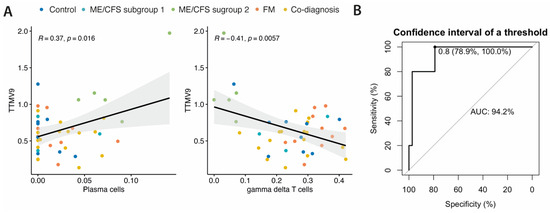(A) Pearson correlation between TTMV9 levels and immune cell ratios. (B) Receiver operating characteristics (ROC) analysis of TTMV expression levels measured by high density microarray in ME/CFS subgroup 2 (n = 5) vs. ME/CFS subgroup 1 (n = 3), FM (n = 10), comorbidity (n = 16), and healthy controls (n = 9). The area under the curve (AUC) and the best threshold value with the corresponding specificity and sensitivity appear indicated.