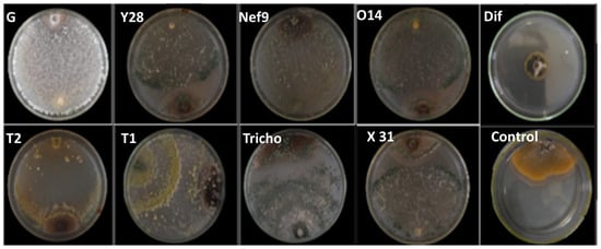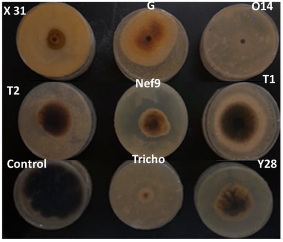 Biological control is an excellent and effective alternative for managing plant diseases [22]. Trichoderma spp. represent a promising source of biological control agents. These microorganisms are adapted to coexist with the host plant, presenting minimal adverse effects. They contribute to plant health by generating protective metabolites, inducing resistance to biotic and abiotic stresses, and promoting growth through the production of phytohormones [23,24]. Various studies conducted globally have demonstrated the biological potential of different Trichoderma species against fungal pathogens [25]. For instance, Nourian et al. [26] assessed the antifungal properties of these antagonistic agents against Diplodia bulgarica in vitro, finding that Trichoderma zelobreve inhibited the growth of the pathogen’s mycelia. Similarly, Taha et al. [27] reported that various Trichoderma isolates markedly hindered the growth of Fusarium species in vitro. The effectiveness of biological control mechanisms is influenced by several factors, including the specific antagonist strain used, the nature of the pathogenic fungus, the characteristics of the host plant, and prevailing environmental conditions [28,29]. In this study, different isolates of Trichoderma spp. demonstrated variable in vitro inhibition capacities, due to their intrinsic properties and the effectiveness of the mechanisms of action involved, namely, antibiosis by the secretion of antifungal metabolites and Volatile Organic Compounds (VOCs), as well as parasitism by the secretion of lytic enzymes.