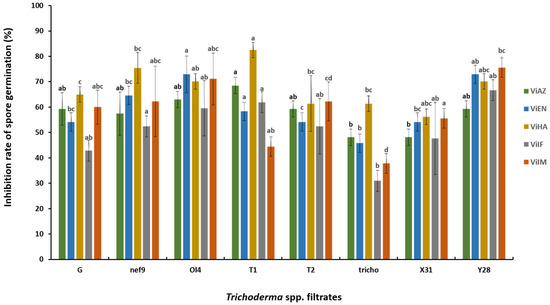 Inhibition rate of spore germination (%) of V. inaequalis on a total of 100 spores after 24 h of incubation by the filtrates of antagonistic Trichoderma spp. of concentration 100%. The data representing the mean inhibition rate with the same letter are not significantly different according to the SNK test performed on mycelial growth (p < 0.05).