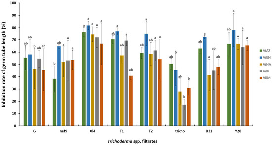 Inhibition rate of germ tube length (%) of V. inaequalis after 24 h of incubation by the filtrates of Trichoderma antagonists of concentration 100%. The data representing the mean inhibition rate, with the same letter are not significantly different according to the SNK test performed on mycelial growth (p < 0.05).
