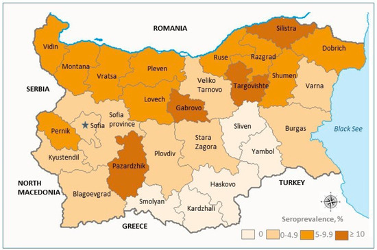 Studies on Ixodid ticks in Bulgaria have revealed an infectivity rate of 31–49% among adult ticks in Sofia and Pleven provinces [10,11] in contrast to the low tick infection rate (1.7%) reported in southeastern Bulgaria [12]. Serologic reactivity to Bbsl has been found in various animal hosts, including wild birds [13], horses [14,15], dogs, sheep, and cows [16,17], and Bbsl have been detected by PCR in rodents [18,19]. However, there are limited data on the seroprevalence of LB among the human population in Bulgaria. Serological studies from neighboring countries report seropositivity rates ranging between 2.3% and 16.2% [20,21,22,23,24,25,26]. In order to better assess the true disease burden and identify high-risk areas for LB, a broader serological investigation among the Bulgarian population is needed.