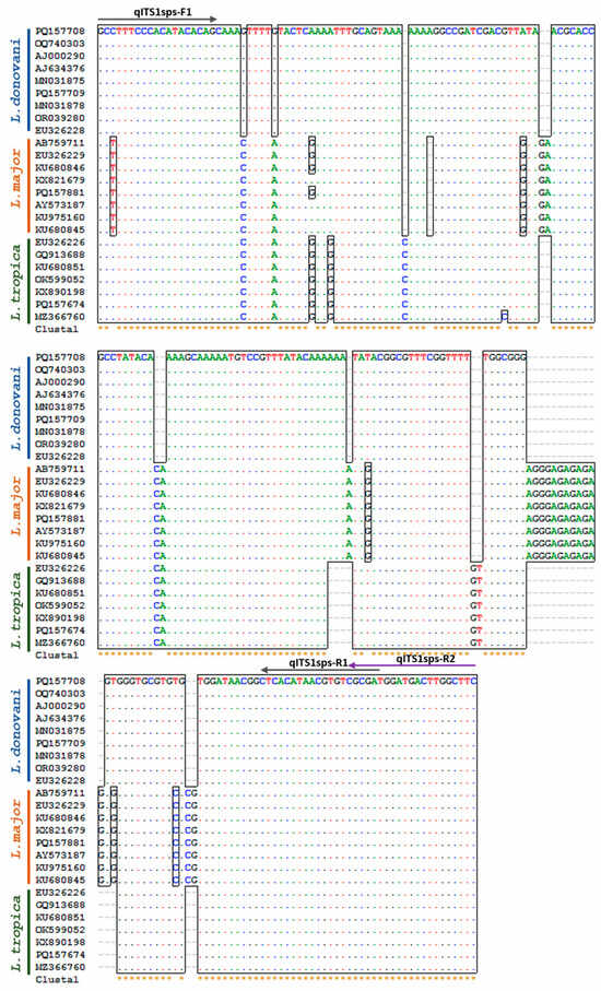 A literature survey was conducted to investigate the targets used to identify the various Leishmania species that cause different manifestations in both human and non-human hosts. Two potential targets reported for the identification of Leishmania species among the Old World Leishmania strains were chosen for the identification of Leishmania species: the ITS-1 gene and the 7SL-RNA gene. These targets have shown high sensitivity in previous studies [19,27,28,29,30]. In silico research was performed, and multiple ITS nucleotide sequences for L. donovani, L. major, and L. tropica were downloaded (File S1_ITS sequences). The consensus sequences in the ITS region were selected for primer designing, as per the experimental design considerations for optimal HRM analysis [31], and two sets of primers were designed and assessed for the ITS-1 gene: qITS1sps-F1/R1 and qITS1sps-F1/R2 (a common forward primer and two different reverse primers for amplicons of different length). Multiple alignment of ITS-1 gene fragment sequences from the Leishmania species, i.e., L. donovani, L. major, and L. tropica, illustrating the selected primer regions and sequence variation within the amplicon of HRM-PCR, are shown in Figure 1. Primers previously used by Nasereddin and Jaffe were employed for the 7SL-RNA gene [30] (Table 2).