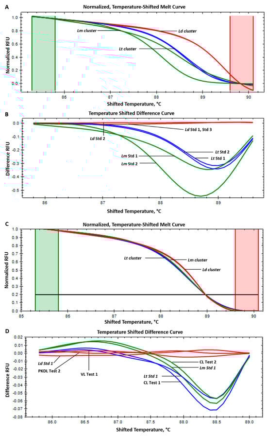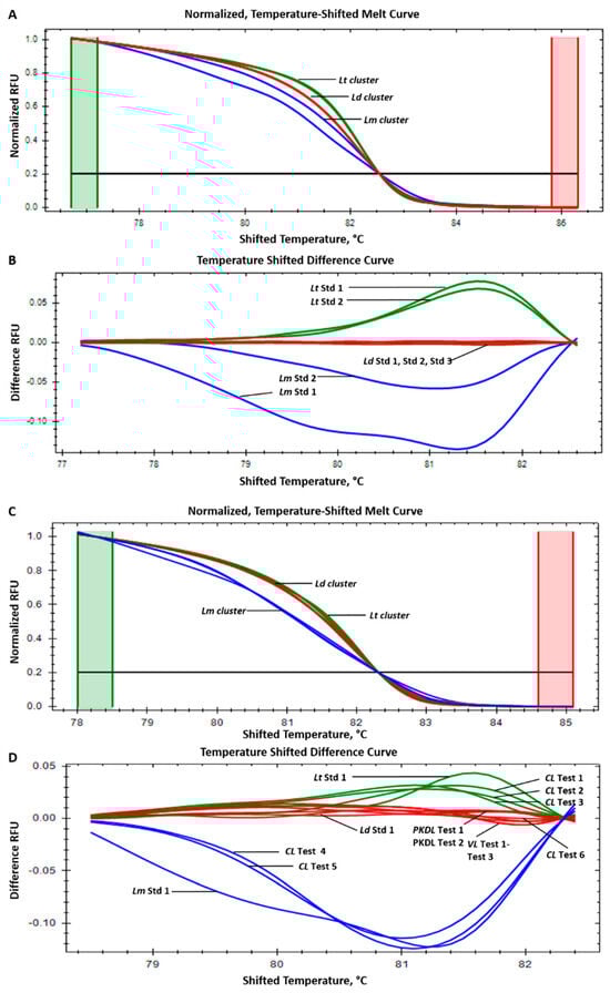 Of the 93 total leishmaniasis samples, ITS-1 HRM-PCR amplified in 68 samples with a sensitivity of 73.11% (Table 4). Overall, 21/30 VL samples and 37/50 PKDL patient samples presented a melting profile (Tm and melting curve) for L. donovani. Additionally, 10/13 CL samples had the melt profiles of L. major (n = 3), L. tropica (n = 6), and L. donovani (n = 1). The melting curves of HRM-PCR positive patient samples were grouped into three clusters specific to reference strains, enabling clear species identification. Normalized, temperature-shifted melting curves and temperature-shifted difference curves for VL, PKDL, and CL samples are shown in Figure 2C,D.