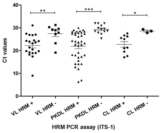 The ITS-1 HRM-PCR positive and negative samples were plotted against the Ct values generated in the kDNA qPCR (indicative of the parasite load in patient samples). A significant correlation was observed among ITS-1 HRM-PCR positive samples, which showed lower Ct values in kDNA qPCR compared to ITS-1 HRM-PCR negative samples (Figure 4). The level of significance for VL, PKDL, and CL patient samples were p = 0.007, p = 0.0002, and p = 0.03, respectively. However, no correlation could be established for the 7SL-RNA HRM-PCR as fewer than 20% of the samples were amplified in the assay.