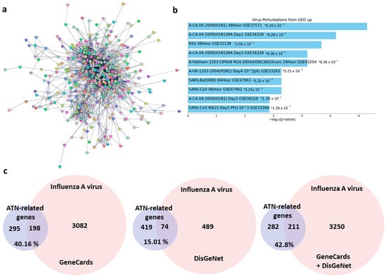 ATN-related gene network and the comparison between the ATN-related gene and the Gene Sets of influenza A virus. (a) Network diagram of ATN-related genes using Cytoscape visualization software. (b) Top 10 pathways with the lowest p-value in virus perturbations of ATN-related gene. * indicates p-value. (c) Respective comparison between ATN-related gene, GeneCards Gene Set and DisGeNet Gene Set of influenza A virus.