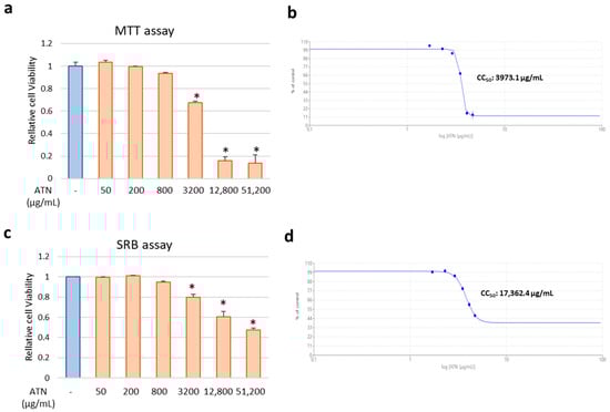 Cytotoxicity of ATN in MDCK cells. MDCK cells were treated with serially diluted ATN (concentrations shown in the figure) and incubated for 48 h. (a,b) Cell viability was determined using the MTT assay. (c,d) Cell viability was determined using the SRB assay. The 50% cytotoxic concentration (CC50) values were calculated using Prism 5.03 software. * indicates p < 0.05 compared to the ATN non-treated control group (n = 3).