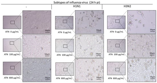 Next, microscopic analysis was conducted to determine whether the survival rate of MDCK cells after influenza infection was recovered by ATN. In the case of non-infected cells, cell survival remained constant, regardless of ATN treatment. In contrast, cells infected with H1N1 or H3N2 showed increased cytotoxicity and debris, which increased cell survival following ATN treatment (100 or 800 μg/mL, respectively) in a dose-dependent manner (Figure 4).
