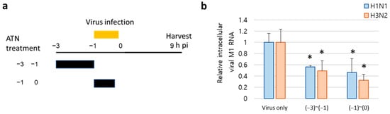 The effect of ATN in the early stages of viral infection was further confirmed by elucidating the intracellular viral mRNA level of the M1 protein. Compared with the virus-only control, ATN (1 mg/mL), added at −3 to −1 (pre-treatment), and −1 to 0 (co-treatment) intervals (Figure 6a), inhibited the mRNA level of the M1 protein gene in both H1N1- and H3N2-infected cells, respectively (Figure 6b). These results indicate that ATN exhibits antiviral activity at an early stage of infection rather than at later stages, including the replication and release processes of the viral lifecycle.