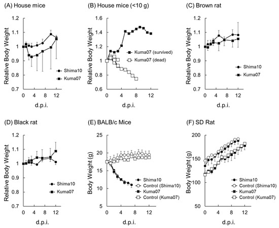 Changes in body weight of house mice (A,B), brown rats (C), black rats (D), BALB/c mice (E) and SD rats (F) inoculated with HPAIVs. In all panels except (B), error bars indicate standard deviation. d.p.i., days post inoculation.
