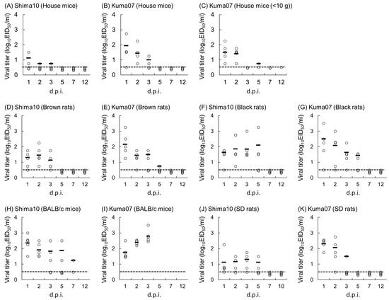 Changes in oral shedding of HPAIVs in wild and laboratory rodents. House mice (A–C), brown rats (D,E), black rats (F,G), BALB/c mice (H,I), and SD rats (J,K) were intranasally inoculated with Shima10 (A,D,F,H,J) or Kuma07 (B,C,E,G,I,K) HPAIVs. White circles represent the viral titers detected in the oral swab for each individual, and horizontal lines indicate the mean titer of positive samples. Dashed lines indicate the detection limit of the viruses (100.5 EID50/mL). d.p.i., days post inoculation.