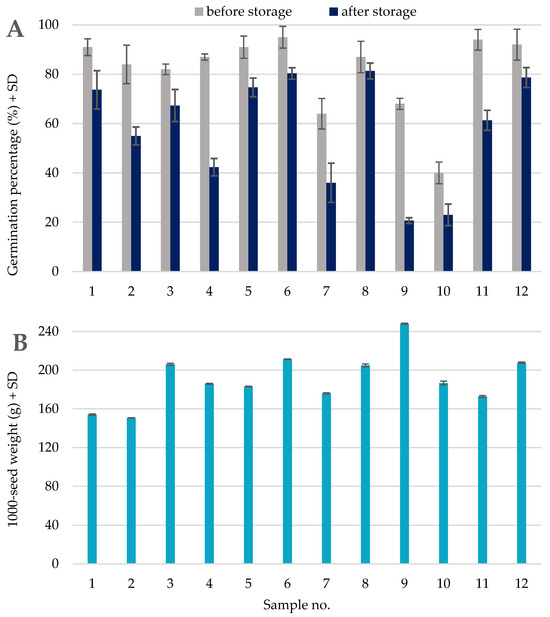 Germination percentage and 1000-seed weight of the twelve seed samples collected in four provinces in southern Poland: Dolnośląskie (sample nos. 1–5, 8); Opolskie (no. 6); Podkarpackie (nos. 7, 9–10); and Lubelskie (nos. 11–12). Values represent means of three replicates (±standard deviation). (A) Germination percentage of the seed samples determined before and after seven months of storage in the same warehouse. (B) Thousand-seed weight.