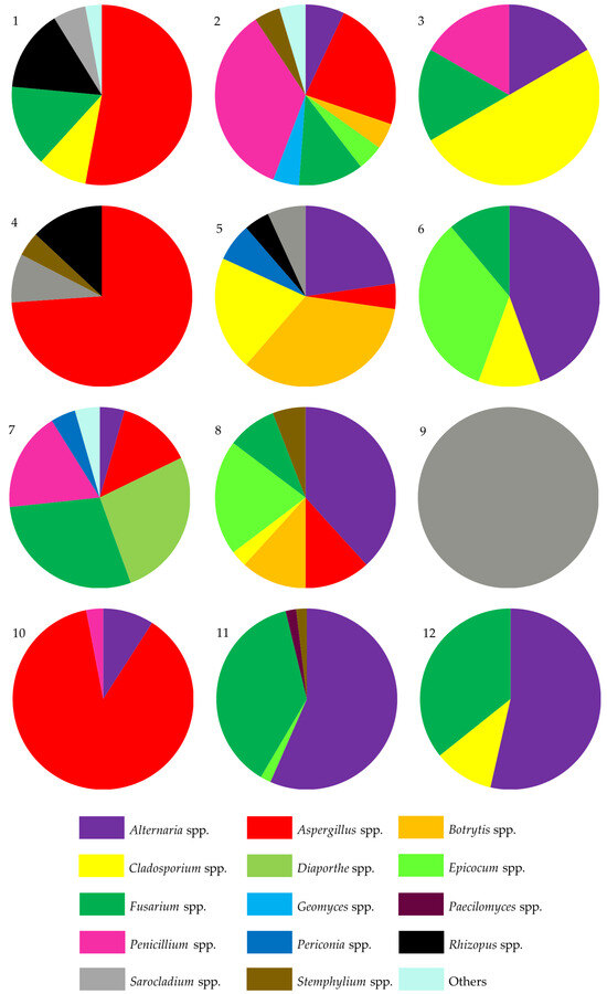 Pie charts showing the percentage of dominant fungal genera isolated from twelve soybean seed samples collected in the following four provinces in southern Poland: Dolnośląskie (nos. 1–5, 8); Opolskie (no. 6); Podkarpackie (nos. 7, 9–10); and Lubelskie (nos. 11–12).