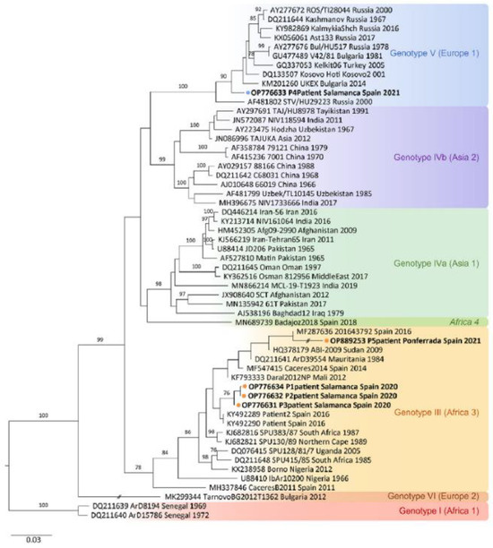 The genotypes are named based on the geographical area where the virus was initially isolated. These are: Africa 1 (genotype I), Africa 2 (genotype II), and Africa 3 (genotype III); Asia 1 (genotype IVa) and Asia 2 (genotype IVb); Europe 1 (genotype V) and Europe 2 (genotype VI) [5,7].