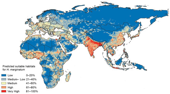 Predicted potential geographic distribution of Hyalomma marginatum on a global scale [17].