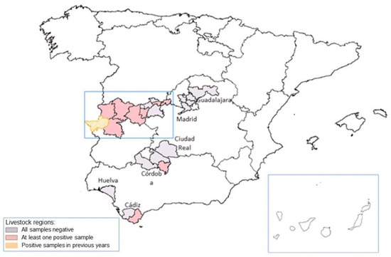 In 2010, H. lusitanicum ticks were detected in the province of Cáceres, which tested positive for CCHFV [26], representing the first finding of this virus in the Iberian Peninsula. As shown in Figure 5, the presence of the virus has been confirmed in ticks in the regions of Extremadura, Castilla-La Mancha, Castilla y León, and Andalusia. Additionally, in 2018, these autonomous communities detected seropositive rates of 70% in wild animals (wild ruminants, wild boars, hares, and rabbits) and 16% in domestic animals (extensive livestock: cattle, sheep, and goats) [27].