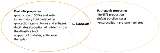 Clostridium butyricum is an obligate, anaerobic, rod-shaped Gram-positive bacterium, spore-forming in various environments, such as the human gastrointestinal tract and soil. These organisms have many applications in fuel industries as by-product producers and in medicine as probiotic strains, especially in Asia [34]. Butyric acid is the main chemical these bacteria produce in fermentation via the but–buk pathway of dietary fiber and other substances not digested by the human digestive system. Many studies indicate that short-chain fatty acids (SCAFs) produced in the intestines by the microbiota, which include butyric acid, influence the regulation of the homeostasis of the immune system and the functioning of the intestinal barrier [35]. Butyric acid is widely researched and known to have anti-inflammatory and anti-cancer properties. Table 1 showed the role of Clostridium butyricum in human health and disease. However, some strains of these organisms have also proved to be neurotoxigenic pathogens [8].