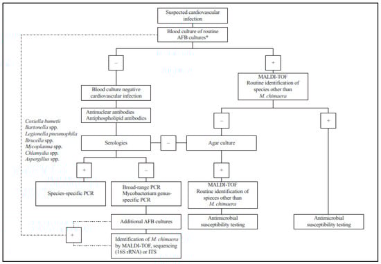 Algorithm for microbiological diagnosis of suspected cardiovascular infections including possible M. chimaera infections (reproduced with permission from Hasse B.) []. AFB, acid-fast bacilli; MALDI-TOF, matrix-assisted laser desorption–ionization time-of-flight mass spectrometry; PCR, polymerase chain reaction. * Among patients meeting exposure criterion and having symptoms suggestive of M. chimaera infection in clinic (assess via upfront AFB cultures).