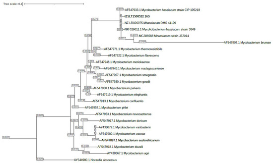 All sequences were trimmed and aligned using ClustalW’s algorithm with default parameters and trimmed to obtain equal-length fragments as customary for phylogenetic analyses. A phylogenetic tree based on 16S rRNA encoding genes was generated using the Molecular Evolutionary Genetics Analysis software v11 (MEGA11) [19]. The maximum likelihood algorithm in combination with the Tamura 3-parameter model was used to assess the phylogenetic relationships between our M. hassiacum 16SrDNA sequence and other publicly available reference sequences belonging to different Mycobacterium species, including previously deposited M. hassiacum sequences (Table 1).