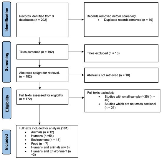 Microsoft Excel® (Microsoft Corporation, Redmond, WA, USA) and EndNote version 20 (Philadelphia, PA, USA) were used to manage the retrieved studies. Duplicate records were eliminated after compiling the search titles and abstracts from the three databases. Subsequently, the titles and abstracts underwent an eligibility screening, employing the following inclusion criteria: Peer-reviewed English articles (i) that examine the prevalence of any of the ESKAPE pathogens in food, animals, humans, and the environment; (ii) or quasi-cross-sectional studies (iii) that report on the total sample size, positive samples, and/or prevalence rates; and (iv) that report on studies conducted in African countries and published between January 2014 and February 2024. After screening the titles and abstracts, the full texts of the eligible studies were evaluated using the same criteria listed above.