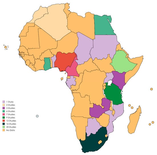 A map showing the number of studies included in this review per country in Africa [https://www.mapchart.net/world.html (accessed on 26 April 2024)]. A summary of studies from 2014 to 2024.