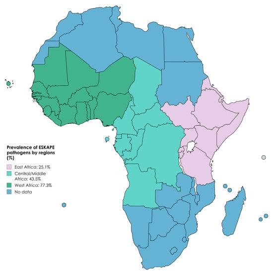 A map showing prevalence of ESKAPE pathogens by regions in Africa [https://www.mapchart.net/world.html (accessed on 28 August 2024)].