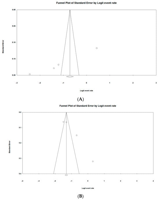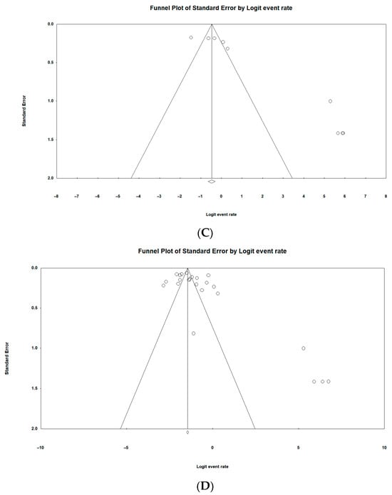 Publication bias was measured using funnel plots to test for symmetry, and this was further complemented using the Begg and Mazumdar rank correlation test and Egger’s regression test. The funnel plot was used to analyze the publication bias. Figure 4A–D display a practically symmetrical distribution of all the included studies on both sides of the funnel plot, indicating a relatively low potential for publication bias of the p-value < 0.04 for A. baumannii, p-value < 0.04 for MALDI-TOF MS, p-value < 0.01 for the West African region, and p-value < 0.01 for years (2010–2020), all in humans, respectively.