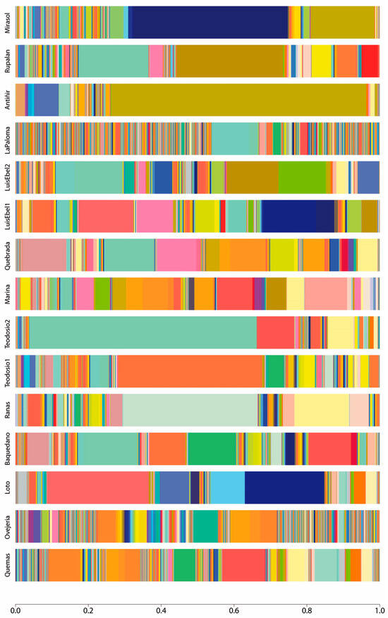 Taxonomy abundance at the species level is represented as a stacked bar plot of each sample. The color pattern of each bar shows the microbial community structure, while the amplitude of each color represents the percentage of abundance of the assigned taxonomy. Remarkable taxa with the most abundance was Pseudomonas sp. SCA2728.1_7 on the Mirasol wetland, represented by the dark blue color, Serratia liquefaciens on Antiñir, denoted by olive color, Pseudomonas fragi on Teodosio2 represented by cyan color, while on Teodosio1 the most abundant specie was Pseudomonas psychrophile, denoted by tomato color.
