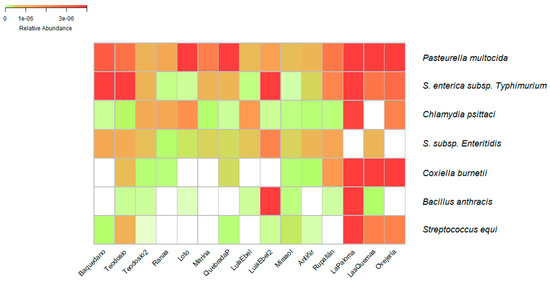 Bacterial species of importance in veterinary medicine were searched within the taxonomic data obtained, which are also included in the list of mandatory notifiable diseases monitored by the Agriculture Livestock Service of Chile (SAG) [38]. From the mentioned list of diseases, some etiologic agents were identified at the species level, present in the water of the urban wetlands. Some of these bacteria were identified in more than one wetland; however, the abundance of these was different (Figure 2). Among the identified species of importance to health and which are notifiable to the SAG were found to be the species Pasteurella multocida, Salmonella enterica subsp. Typhimurium, Salmonella enterica subsp. Enteritidis, Chlamydia psittaci, Coxiella burnetii, Bacillus anthracis, and Streptococcus equi, which are responsible for the diseases fowl cholera, salmonellosis, psittacosis, Q fever, carbuncle, and equine adenitis, respectively.