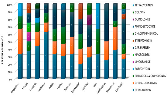 The metagenomic analysis revealed a diverse repertory of antimicrobial-resistant genes in the environmental DNA recovered from the water of urban wetlands. The different genes identified according to the antimicrobial resistance family to which they belong were grouped, and the resistance that confers was identified (Figure 4, Supplementary Table S2). These ARGs included genes that confer resistance to antibiotics commonly used in human clinical treatments, such as β-lactams, carbapenems, and chloramphenicol, as well as genes associated with resistance to antibiotics used in veterinary medicine, such as macrolides, tetracyclines, and quinolones. The presence of these genes and the kind of genes identified were different in each urban wetland (Figure 4, Table 1, Supplementary Table S2), which may be related to the use of antibiotics based on compounds such as amoxicillin, ampicillin, ciprofloxacin, nalidixic acid, and imipenem.