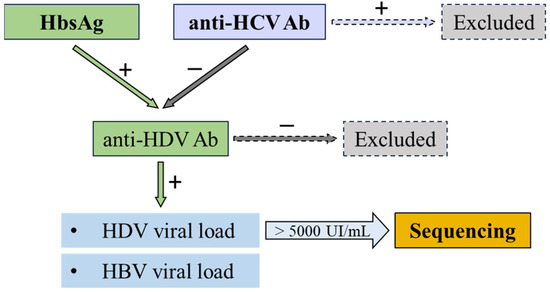 The patients who tested positive for HBsAg and anti-HDV Ab were further included in our study for HDV sequencing and detection of both HBV and HDV viral loads. Patients who were also positive for HCV and HIV or those with autoimmune hepatitis or alcoholic liver disease were excluded (Figure 1).
