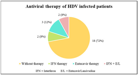 All patients included in this study had positive HDV-RNA viral loads higher than 5000 IU/mL with a median value of 961,210 IU/mL. All patients had positive HBV-DNA viral loads with a median value of 392 IU/mL (Table 3). The conversion from IU/mL to copies/mL is performed by applying a conversion factor of 37.