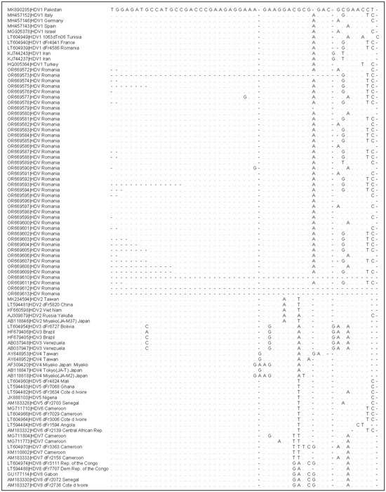 Different methods have been described over time to achieve this goal, from hybridization, restriction fragment length polymorphism (RT-LAMP), to RFLP and PCR followed by sequencing [55,56,57]. Among them all, genotyping by direct sequencing followed by phylogenetic analysis where specific sequences from each genotype are tracked, identified, and stored in different gene banks, e.g., GenBank, remains the gold standard used in the identification of the eight HDV genotypes. Very important in the use of such a method are the primers chosen, because they must allow the isolation of a region within the HDV genome that presents a high conservation of genetic material along the phylogenetic evolution, but also includes all the sought genotypes. Thus, in our study, primers were used that identified a sequence from the HDV genome of approximately 405 base pairs that codes for the HDV antigen [10,11]. Although only samples with high HDV viral loads were included in this study, for five patients out of forty-nine, no amplicons were obtained by the nested-PCR reaction.