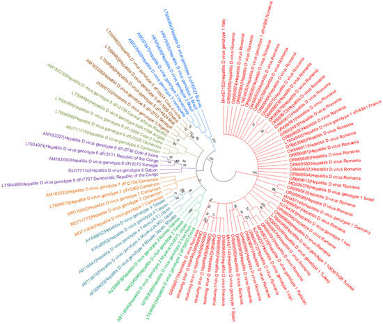 Sequenced fragments were edited and assembled using DNADynamo software (#00011) and deposited into the GenBank database. Subsequently, the obtained sequences were aligned with the sequences of hepatitis delta virus (different genotypes) published in the GenBank (http://blast.ncbi.nlm.nih.gov/Blast.cgi (accessed on 5 November 2023)). Multiple alignments of sequences were performed using MUSCLE integrated in MEGA X software [40]. The evolutionary history was inferred using the maximum likelihood method and general time reversible model [41], and the robustness of the ML trees was inferred using 1000 bootstrap replicates [42]. Initial tree(s) for the heuristic search were obtained automatically by applying Neighbor-Join and BioNJ algorithms to a matrix of pairwise distances estimated using the maximum composite likelihood (MCL) approach, and then selecting the topology with a superior log likelihood value, a discrete Gamma distribution being used to model evolutionary rate differences among sites, with the rate variation model allowing for some sites to be evolutionarily invariable. Evolutionary analyses were conducted in MEGA X [43].