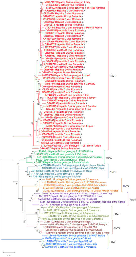 Phylogenetic relationships of HDV from Romania and other reported HDV sequences (different genotypes) and the grouping of the identified HDV-1 strains. The phylogenetic tree was inferred by using the maximum likelihood method and general time reversible model with 1000 bootstrap replication. The tree with the highest log likelihood (−6682.21) is shown. Bootstrap values are indicated at the nodes. The analysis involved 88 nucleotide sequences and there was a total of 419 positions in the final dataset. The scale bar indicates 0.10 nucleotide substitutions per nucleotide position. The HDV sequences detected in this study are marked with an asterisk (*).