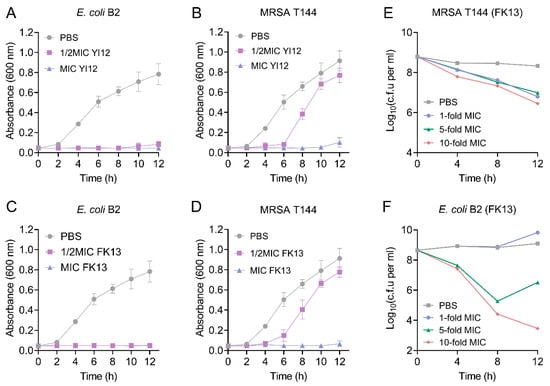 Subsequently, we monitored the growth patterns of the two MDR isolates, MRSA T144 and E. coli B2, in the presence of YI12 and FK13. As shown in Figure 2, when the concentration of the AMP reached MIC values, a significant inhibitory effect of YI12 and FK13 on the test strain was observed, leading to almost no progress in bacterial growth and reproduction within 12 h. When the concentration of the AMP was at 50% of the MIC, the growth rate of MRSA T144 was completely restricted within the time frame of 0 to 4 h. However, as time passed, the growth of MRSA T144 showed a sharp climb, approaching the drug-free group (Figure 2B,D). By contrast, the growth of E. coli B2 was completely restricted in the sub-MICs of the two peptides during 12 h (Figure 2A,C). Based on these findings, we concluded that the two AMPs could effectively prevent the growth of MDR isolates, especially Gram-negative bacteria. Furthermore, we took FK13 as a typical representative to test its bactericidal effect against MRSA T144 and E. coli B2. As shown in Figure 2E,F, FK13 exhibited great bactericidal activity against MDR bacteria in a concentration-dependent manner, with both 10-fold MIC concentrations exerting the most obvious CFUs reduction of 2–5 log10 at 12 h.