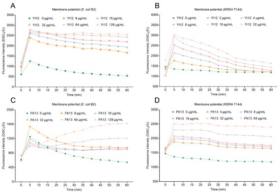 Proton motive force (PMF) is the driving force that facilitates the movement of protons across membranes in the direction of their electrochemical potential gradient [23]. PMF is composed of transmembrane potential (∆Ψ) and transmembrane proton gradient (∆pH). These two elements complement and balance each other to achieve homeostasis. Here, we evaluated the changes in membrane potential in two bacteria exposed to two AMPs using a potentiometric probe DiSC3(5), which would accumulate and manifest with increasing fluorescence once the membrane potential was dissipated. As shown in Figure 6, YI12 and FK13 treatments resulted in increased fluorescence intensity in a concentration-dependent manner in both MRSA T144 and E. coli B2, indicating that the two AMPs drastically dissipated the membrane potential of these two bacteria. Collectively, these data demonstrated that YI12 and FK13 could disrupt membrane permeability and dissipate membrane potential.