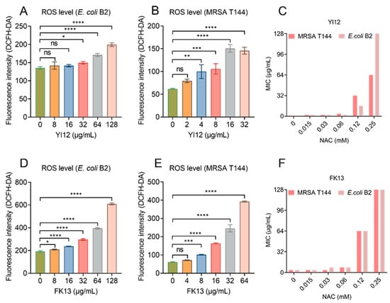YI12 and FK13 trigger the generation of ROS in E. coli B2 and MRSA T144. Generation of ROS in E. coli B2 (A,D) and MRSA T144 (B,E), determined by 2′,7′-dichlorodihydrofluorescein diacetate (DCFH-DA, excitation wavelength 488 nm, emission wavelength 525 nm). The addition of the ROS scavenger NAC significantly inhibited the effects of YI12 and FK13 on MRSA T144 and E. coli B2 (C,F). Statistical analysis was conducted through nonparametric one-way analysis (ns, not significant; * p < 0.05, ** p < 0.01, *** p < 0.001, **** p < 0.0001).