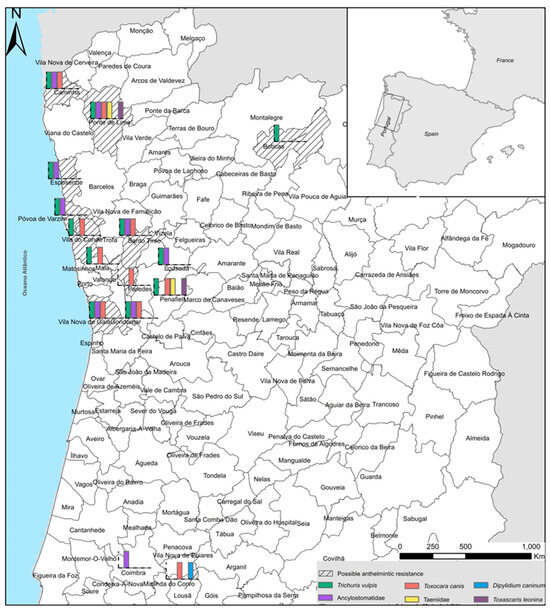 Figure 1. Geographical distribution and diversity of intestinal helminths identified and possible anthelmintic resistance in dogs’ helminths in different municipalities of the north and centre of Portugal.